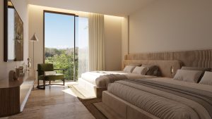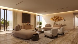 The homes themselves are expansive, ranging from two to four bedrooms, with interiors stretching from 2,142 to over 4,000 square feet. Terraces extend the living space outward, some reaching 1,800 square feet, offering uninterrupted views of water and sky. Penthouses crown the development with private roof gardens, sanctuaries above the treetops.